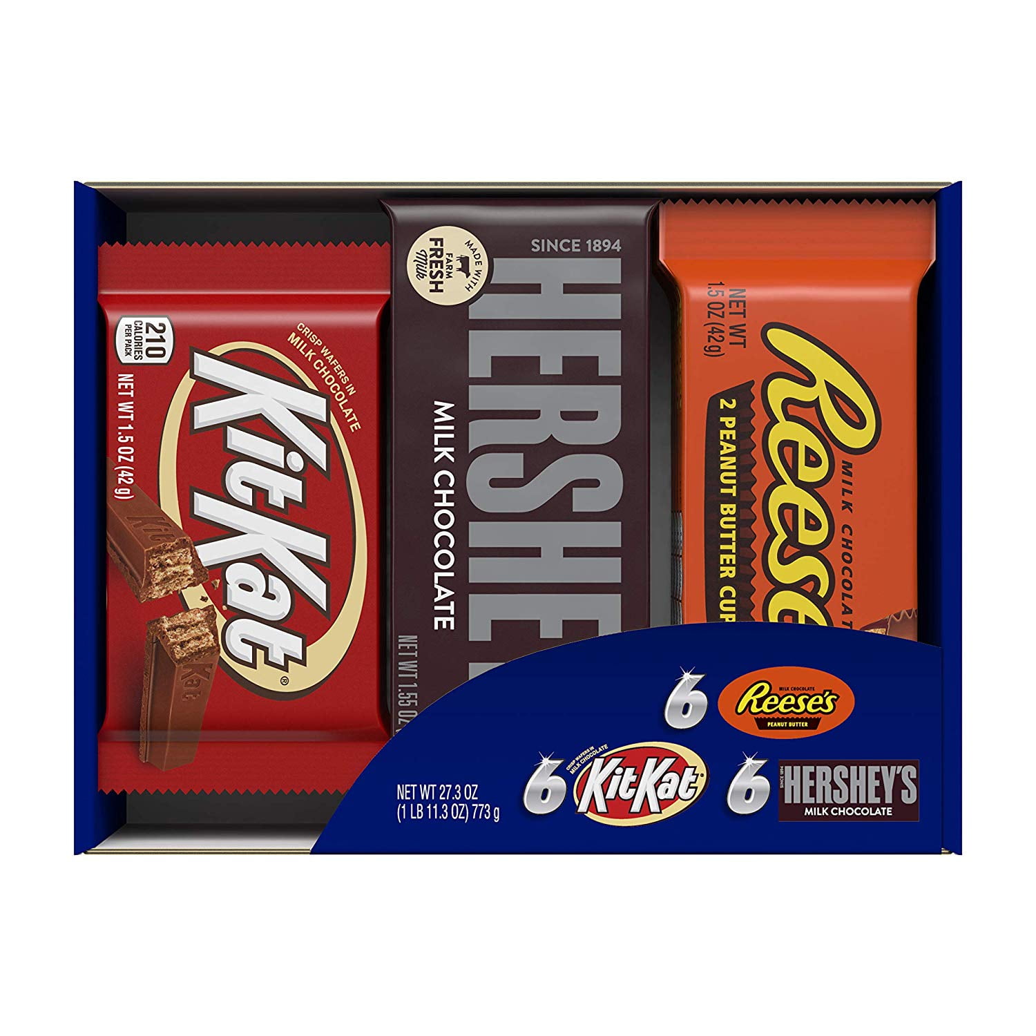 Hersheys Chocolate Candy Bar Assorted Variety Box Hersheys Milk Chocolate Kit Kat Reeses Cups Full Size Bars 18 Count Gift Box Walmart Com